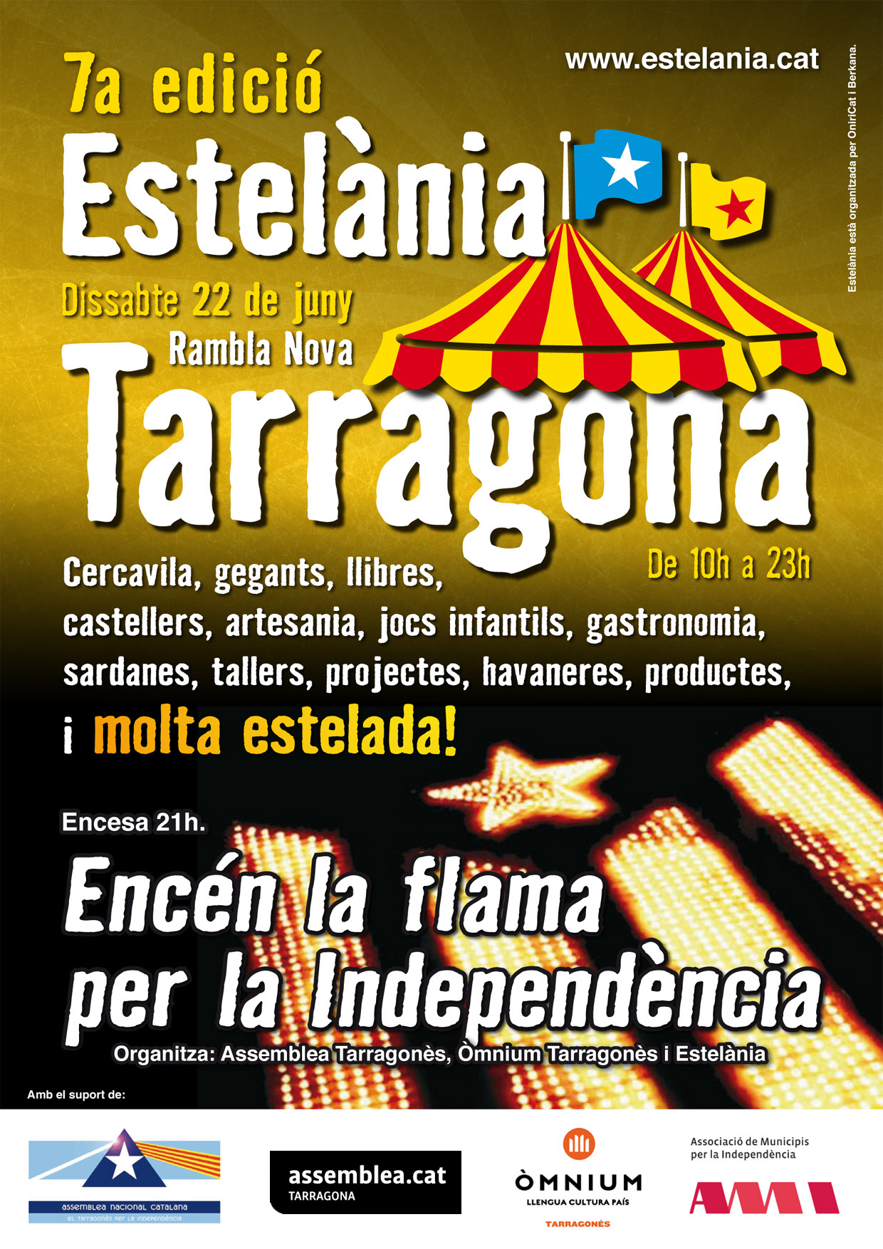 La 7a edició d’Estelània es va celebrar a la Rambla Nova de Tarragona el passat 22 de juny coincidint amb “L’encén la flama“ organitzada per ANC Tarragona. Ens van acompanyar més de 50 expositors i ens van presentar els seus projectes entitats com Escola en català, Fundació d’Estudis Històrics de Catalunya i Centre d’Agermanament Occitano-català.